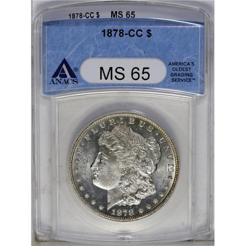 <B>1878-CC<img border='0' src='http://www.heritagecoins.com/images/star.gif' width=10 height=10>$1> MS65 ANACS.</B></I> Shimmering surfaces have a fiery luster. Liberty's hair is well detailed on this Carson City Gem, and the marks present are consistent with the grade.