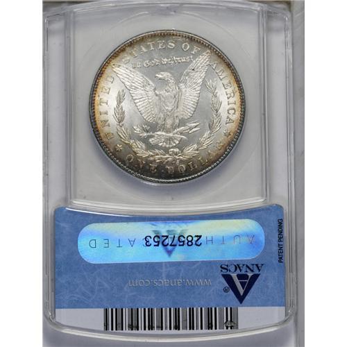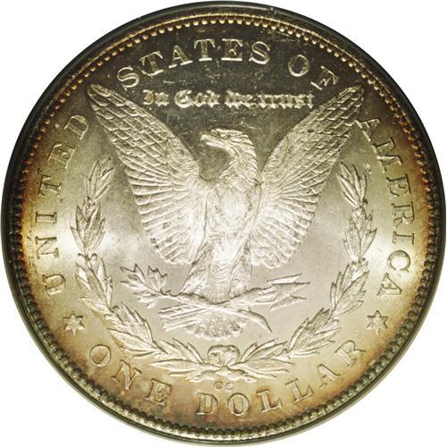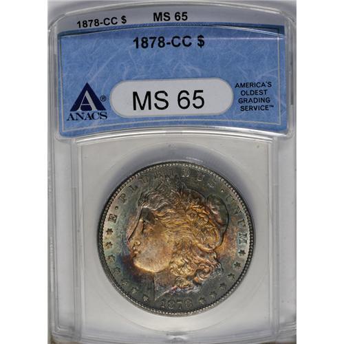 <B>1878-CC<img border='0' src='http://www.heritagecoins.com/images/star.gif' width=10 height=10>$1> MS65 ANACS.</B></I> Splashes of sea-green and orange consume the obverse. The reverse has a brilliant center framed by golden-brown and plum-red peripheral patina. This first year Carson City Morgan dollar is well struck in the centers, and only the eagle's claws are softly defined.