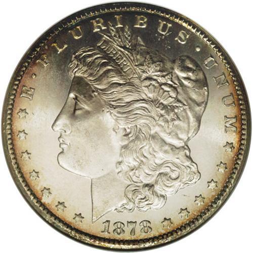 <B>1878-CC S$1 MS65 Deep Mirror Prooflike NGC.</B></I> This is an outstanding Gem that displays a high degree of field-motif contrast. The mildly frosted design features are the recipients of a powerful strike (not unusual for this issue), as evidenced by sharp delineation in the hair over Liberty's ear and on the breast feathers. Wisps of reddish-tan and cobalt-blue cling to the rim areas, forming a pleasing frame for the essentially untoned centers. Some minute obverse milling marks preclude an even higher grade. Census: 32 in 65 Deep Mirror Prooflike, 0 finer (2/07).<BR><BR><b>Shipping:</b> Coins & Currency (<a target="_blank" href="http://www.heritageauctions.com/common/shipping.php">view shipping information</a>)