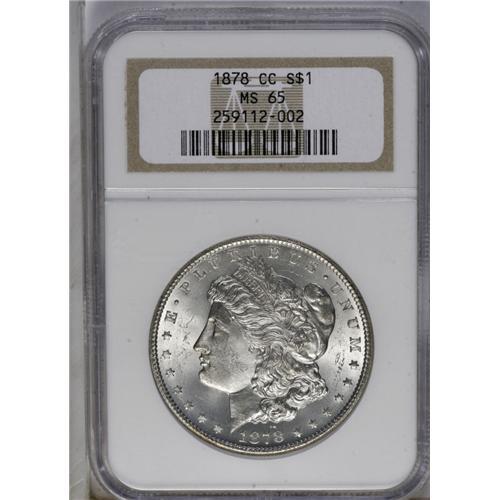 <B>1878-CC<img border='0' src='http://www.heritagecoins.com/images/star.gif' width=10 height=10>$1> MS65 NGC.</B></I> Brilliant and boldly struck with bright mint frost and a few small, scattered abrasions. Always popular as a first year CC date.