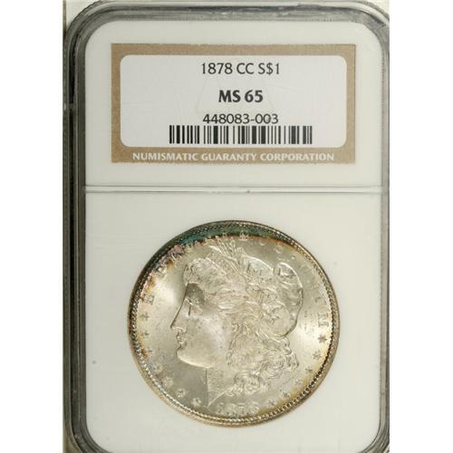 <B>1878-CC S$1 MS65 NGC.</B></I> This beautifully frosty Gem was from the first issue of Morgan dollars produced by the Carson City Mint. Traces of gold, russet-red, and teal iridescence adorn the obverse periphery, while the reverse exhibits more vibrant golden-orange and crimson patina, also near the border. Well preserved and nearly mark-free.<BR><BR><b>Shipping:</b> Coins & Currency (<a target="_blank" href="http://www.heritageauctions.com/common/shipping.php">view shipping information</a>)
