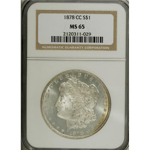 <B>1878-CC S$1 MS65 NGC.</B></I> This highly lustrous Gem has flashy fields and a hint of golden toning at the lower right obverse. Exactingly struck with richly frosted devices.<BR><BR><b>Shipping:</b> Coins & Currency (<a target="_blank" href="http://www.heritageauctions.com/common/shipping.php">view shipping information</a>)