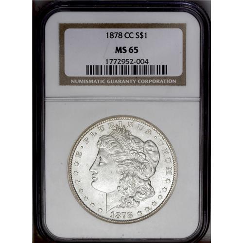 <B>1878-CC<img border='0' src='http://www.heritagecoins.com/images/star.gif' width=10 height=10>$1> MS65 NGC.</B></I> This is a highly popular issue representing the first Morgan silver dollar coined in Carson City. It is a historical issue due to the extensive silver mining operations in Nevada, providing a direct link to the introduction of this coinage design, originally known by the name "Bland dollars." This particular Gem example is fully lustrous with frosty obverse and reverse surfaces. A few tiny marks on each side are expected for the grade.