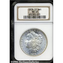 <B>1878-CC<S$1> MS65 NGC.</B></I> Well struck, highly lustrous, and essentially untoned, with a pleasing, clean overall appearance, and just one noticeable surface blemish, on the reverse, to the left of the eagle's wing. <BR><BR><B>Important notice:</B> Heritage usually auctions material at the rate of 200-250 lots per hour. On some occasions eBay Live bid software or the Internet may not be able to keep up with the pace of the auction. We recommend placing a realistic absentee bid now as insurance to avoid disappointment. Occasionally the auctioneer may eliminate or reject an eBay Live bid, and the auctioneer may also reopen a lot after the close of the eBay live bidding (usually because we missed an audience bid), and may reject your bid even if it shows you as the winning bidder. By bidding via eBay Live, you agree that Heritage may award the lot to another bidder at its sole discretion under the circumstances described above or any other reasonable circumstances. Since eBay bids are not shown to us until we open the lot on the floor, we treat those bids just like floor bids. In most cases the floor responds before the eBay bid is presented to us, due to Internet lag time, so for consistency we have made it a policy that floor bids are always considered first over tie eBay live bids. Also please note that all Heritage lots purchased through eBay Live carry a 20% Buyer's Premium. Please make sure you read the Terms and Conditions before you bid.