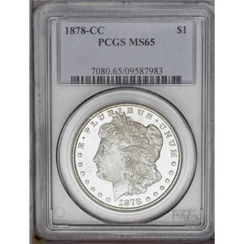 <B>1878-CC<img border='0' src='http://www.heritagecoins.com/images/star.gif' width=10 height=10>$1> MS65 PCGS.</B></I> A frosty Gem with exceptional eye appeal. Both sides are fully lustrous with traces of tan patina limited to the highest design points.