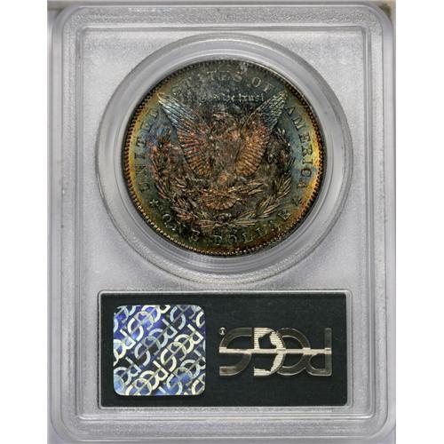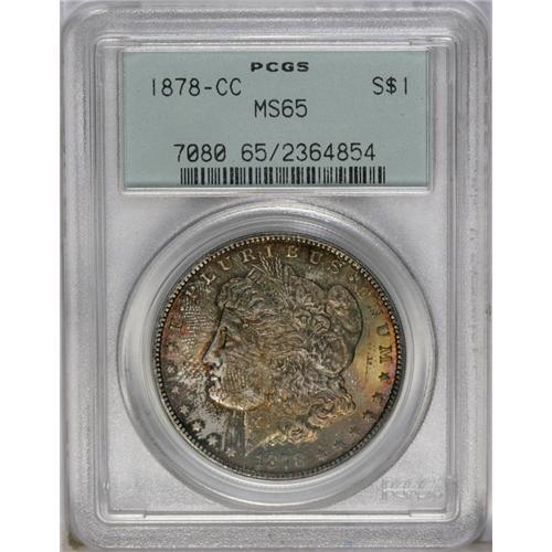 <B>1878-CC<img border='0' src='http://www.heritagecoins.com/images/star.gif' width=10 height=10>$1> MS65 PCGS.</B></I> A lustrous Gem that is toned in red and gold. Well struck with only a few abrasions, the most noteworthy of which is one on Liberty's neck that keeps it from a higher grade.
