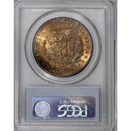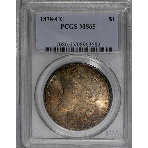 <B>1878-CC<img border='0' src='http://www.heritagecoins.com/images/star.gif' width=10 height=10>$1> MS65 PCGS.</B></I> A lustrous and boldly stuck Carson City Gem, subtly toned orange and red on the obverse. The well-preserved reverse has more intense sunset patina with magenta at the rim.