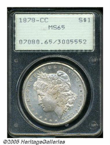 <B>1878-CC<S$1> MS65 PCGS.</B></I> An outstanding example in an old style PCGS holder. The surfaces are fully brilliant and frosty with only subtle lilac color on the obverse.