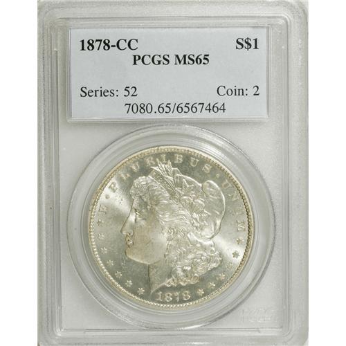<B>1878-CC S$1 MS65 PCGS.</B></I> Both of the Cs in the mintmark are filled by die chips. Sharply struck and lightly toned on the obverse, with a virtually untoned reverse and frosty, coruscant luster that produces spinning cartwheels in the obverse and reverse fields. Minimally abraded, as expected, with a couple of faint marks on the cheek that prevent an even loftier grade assessment.<BR><BR><b>Shipping:</b> Coins & Currency (<a target="_blank" href="http://www.heritageauctions.com/common/shipping.php">view shipping information</a>)