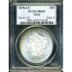 1878-CC S$1 MS65 PCGS. GSA. A whisper of light gol <B>1878-CC S$1 MS65 PCGS.</B></I> GSA. A whisper of light gold color hugs the left obverse border. Lustrous surfaces reveal well struck design elements, and just a couple of minute marks on Liberty's cheek. <BR><BR><B>Important notice:</B> Heritage usually auctions material at the rate of 200-250 lots per hour. On some occasions eBay Live bid software or the Internet may not be able to keep up with the pace of the auction. We recommend placing a realistic absentee bid now as insurance to avoid disappointment. Occasionally the auctioneer may eliminate or reject an eBay Live bid, and the auctioneer may also reopen a lot after the close of the eBay live bidding (usually because we missed an audience bid), and may reject your bid even if it shows you as the winning bidder. By bidding via eBay Live, you agree that Heritage may award the lot to another bidder at its sole discretion under the circumstances described above or any other reasonable circumstances. Since eBay bids are not shown to us until we open the lot on the floor, we treat those bids just like floor bids. In most cases the floor responds before the eBay bid is presented to us, due to Internet lag time, so for consistency we have made it a policy that floor bids are always considered first over tie eBay live bids. Also please note that all Heritage lots purchased through eBay Live carry a 20% Buyer's Premium. Please make sure you read the Terms and Conditions before you bid. This lot is being auctioned in conjunction with a live floor auction by Heritage Galleries & Auctioneers. All final auction and invoice information will be supplied by Heritage Galleries & Auctioneers, and all other information should be considered preliminary. Lot:7306