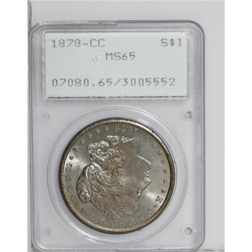 <B>1878-CC<img border='0' src='http://www.heritagecoins.com/images/star.gif' width=10 height=10>$1> MS65 PCGS.</B></I> Light cream toning graces this lustrous and exactingly struck Gem. Well preserved despite a few pinpoint carbon flecks. Certified in a first generation holder.