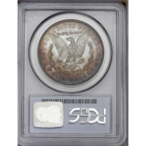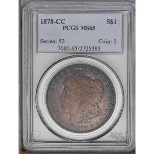 <B>1878-CC<img border='0' src='http://www.heritagecoins.com/images/star.gif' width=10 height=10>$1> MS65 PCGS.</B></I> Lilac-rose surfaces ringed in cobalt-blue accent the obverse while the reverse gives us a creamy-white eagle surrounded by the same melange of color.