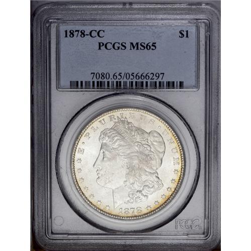 <B>1878-CC<img border='0' src='http://www.heritagecoins.com/images/star.gif' width=10 height=10>$1> MS65 PCGS.</B></I> Lovely medium intensity cobalt-blue and lavender toning blankets the reverse, while the obverse displays a narrow peripheral ring of light gold. The surfaces emit pleasing luster and show minute contact marks on Liberty's cheek, on which light roller marks are also seen. <BR><BR><B>Important notice:</B> Heritage usually auctions material at the rate of 200-250 lots per hour. On some occasions eBay Live bid software or the Internet may not be able to keep up with the pace of the auction. We recommend placing a realistic absentee bid now as insurance to avoid disappointment. Occasionally the auctioneer may eliminate or reject an eBay Live bid, and the auctioneer may also reopen a lot after the close of the eBay live bidding (usually because we missed an audience bid), and may reject your bid even if it shows you as the winning bidder. By bidding via eBay Live, you agree that Heritage may award the lot to another bidder at its sole discretion under the circumstances described above or any other reasonable circumstances. Since eBay bids are not shown to us until we open the lot on the floor, we treat those bids just like floor bids. In most cases the floor responds before the eBay bid is presented to us, due to Internet lag time, so for consistency we have made it a policy that floor bids are always considered first over tie eBay live bids. Also please note that all Heritage lots purchased through eBay Live carry a 20% Buyer's Premium. Please make sure you read the Terms and Conditions before you bid. This lot is being auctioned in conjunction with a live floor auction by Heritage Galleries & Auctioneers. All final auction and invoice information will be supplied by Heritage Galleries & Auctioneers, and all other information should be considered preliminary. Lot:3210 <BR><BR><B>Winning Notification and Billing:</B> After the FINAL session in this auction is complete, Heritage will send e-mail and snail mail invoices. This process normally takes several days. All final auction and invoice information will be supplied by Heritage Galleries & Auctioneers, and all other information should be considered preliminary. <BR><BR>This auction will be conducted on a live auction floor and over the Internet through eBay Live. If you choose to place an absentee bid, please take a moment to <font color='#0000ff'><u><a href='http://pages.ebay.com/liveauctions/help/before/laabsentee.html'>learn how eBay Live absentee bidding works</a></u></font><font color='#000000'>