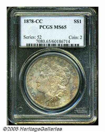 <B>1878-CC<S$1> MS65 PCGS.</B></I> Mottled deep violet, orange, green and blue coat the obverse of this example. Nicely lustrous, especially on the reverse. A few short abrasions are noted, especially on Liberty's jaw and in the lower left obverse field.