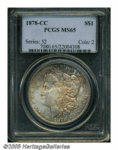 <B>1878-CC<S$1> MS65 PCGS.</B></I> Mottled violet and crimson with a few peripheral hints of indigo. Still nicely lustrous beneath the toning, and free of distracting scuffs.