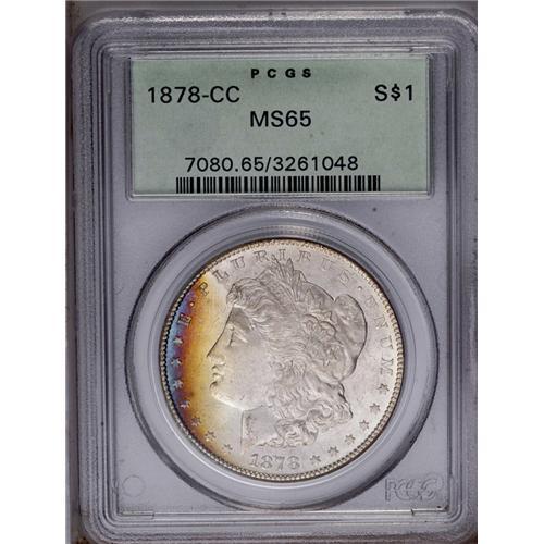 <B>1878-CC S$1 MS65 PCGS.</B></I> Sharply struck with blazing mint luster and minimal abrasions. A vivid band of golden-orange, crimson, and cobalt-blue iridescence resides near the left obverse and reverse peripheries. This highly attractive Gem resides in a green label PCGS holder.<BR><BR><b>Shipping:</b> Coin/Currency (<a target="_blank" href="http://www.heritageauctions.com/common/shipping.php">view shipping information</a>)