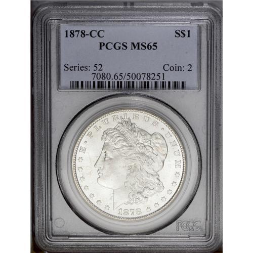 <B>1878-CC<img border='0' src='http://www.heritagecoins.com/images/star.gif' width=10 height=10>$1> MS65 PCGS.</B></I> Subtle hints of light tan-gold occasionally visit the highly lustrous surfaces, especially on the obverse. Sharp definition is noted on the motifs, including excellent delineation in the hair over Liberty's ear. Light marks on Liberty's face and neck are mentioned for accuracy. This coin presents an overall "pleasing" look. <BR><BR><B>Important notice:</B> Heritage usually auctions material at the rate of 200-250 lots per hour. On some occasions eBay Live bid software or the Internet may not be able to keep up with the pace of the auction. We recommend placing a realistic absentee bid now as insurance to avoid disappointment. Occasionally the auctioneer may eliminate or reject an eBay Live bid, and the auctioneer may also reopen a lot after the close of the eBay live bidding (usually because we missed an audience bid), and may reject your bid even if it shows you as the winning bidder. By bidding via eBay Live, you agree that Heritage may award the lot to another bidder at its sole discretion under the circumstances described above or any other reasonable circumstances. Since eBay bids are not shown to us until we open the lot on the floor, we treat those bids just like floor bids. In most cases the floor responds before the eBay bid is presented to us, due to Internet lag time, so for consistency we have made it a policy that floor bids are always considered first over tie eBay live bids. Also please note that all Heritage lots purchased through eBay Live carry a 20% Buyer's Premium. Please make sure you read the Terms and Conditions before you bid. This lot is being auctioned in conjunction with a live floor auction by Heritage Galleries & Auctioneers. All final auction and invoice information will be supplied by Heritage Galleries & Auctioneers, and all other information should be considered preliminary. Lot:3213 <BR><BR><B>Winning Notification and Billing:</B> After the FINAL session in this auction is complete, Heritage will send e-mail and snail mail invoices. This process normally takes several days. All final auction and invoice information will be supplied by Heritage Galleries & Auctioneers, and all other information should be considered preliminary. <BR><BR>This auction will be conducted on a live auction floor and over the Internet through eBay Live. If you choose to place an absentee bid, please take a moment to <font color='#0000ff'><u><a href='http://pages.ebay.com/liveauctions/help/before/laabsentee.html'>learn how eBay Live absentee bidding works</a></u></font><font color='#000000'>