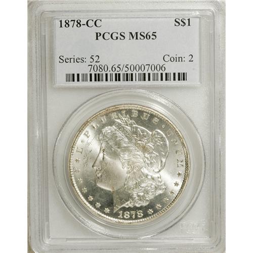 <B>1878-CC S$1 MS65 PCGS.</B></I> Swirling luster adorns essentially untoned surfaces that have been subjected to a well executed strike. Indeed, excellent definition occurs on the hair at Liberty's ear and the eagle's breast feathers. A few light marks do not disturb. David Bowers (2006) exclaims that: " ... the 1878-CC is a bit harder to find in higher grades than market prices indicate."<BR><BR><b>Shipping:</b> Coins & Currency (<a target="_blank" href="http://www.heritageauctions.com/common/shipping.php">view shipping information</a>)
