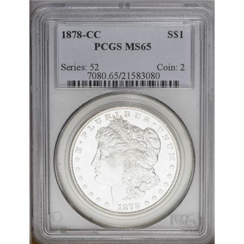 <B>1878-CC<img border='0' src='http://www.heritagecoins.com/images/star.gif' width=10 height=10>$1> MS65 PCGS.</B></I> This is a beautiful, essentially brilliant, mildly frosty Gem with watery semi-prooflike fields and very sharp striking details. A few light russet toning specks are noted on the upper left reverse, as a few wispy scrapes and abrasions, mainly in the field areas, preclude an even loftier grade designation.<BR><I>From The Alexander Collection.</B></I>