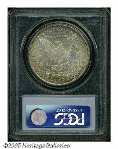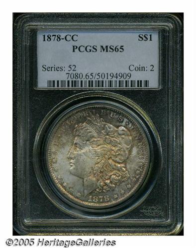 <B>1878-CC<S$1> MS65 PCGS.</B></I> This richly toned Gem has extensive speckled toning on both sides, mainly in shades of orange, purple-red, and cobalt-blue. Vibrantly lustrous, the carefully preserved surfaces display a faint luster graze on Liberty's cheek, and a single noticeable scrape, on her neck. The reverse only shows a couple of trivial field marks. A shimmering, no-questions Gem.