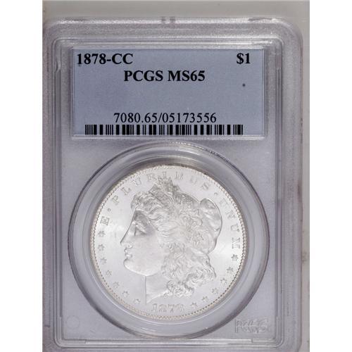 <B>1878-CC<img border='0' src='http://www.heritagecoins.com/images/star.gif' width=10 height=10>$1> MS65 PCGS.</B></I> VAM-11. A Top 100 Variety. This first-year CC-mint Morgan has dazzling luster and an intricate strike. The eye appeal is pleasing, and the brilliant surfaces have only marginal marks.