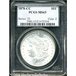 <B>1878-CC<S$1> MS65 PCGS.</B></I> An exquisitely struck and beautifully preserved Gem that has frosty luster and exemplary eye appeal. A popular first year Carson City issue. <BR><BR><B>Important notice:</B> Heritage usually auctions material at the rate of 200-250 lots per hour. On some occasions eBay Live bid software or the Internet may not be able to keep up with the pace of the auction. We recommend placing a realistic absentee bid now as insurance to avoid disappointment. Occasionally the auctioneer may eliminate or reject an eBay Live bid, and the auctioneer may also reopen a lot after the close of the eBay live bidding (usually because we missed an audience bid), and may reject your bid even if it shows you as the winning bidder. By bidding via eBay Live, you agree that Heritage may award the lot to another bidder at its sole discretion under the circumstances described above or any other reasonable circumstances. Since eBay bids are not shown to us until we open the lot on the floor, we treat those bids just like floor bids. In most cases the floor responds before the eBay bid is presented to us, due to Internet lag time, so for consistency we have made it a policy that floor bids are always considered first over tie eBay live bids. Also please note that all Heritage lots purchased through eBay Live carry a 20% Buyer's Premium. Please make sure you read the Terms and Conditions before you bid.