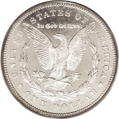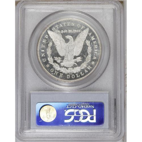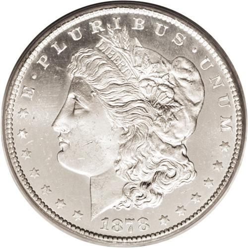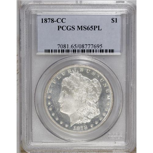 <B>1878-CC<img border='0' src='http://www.heritagecoins.com/images/star.gif' width=10 height=10>$1> MS65 Prooflike PCGS.</B></I> According to Wayne Miller (1982), the 1878-CC is "one of the most consistently well struck of all Morgan dollars." That is certainly true of this coin. What is not usually seen, however, is the sharp white-on-black contrast seen on this piece. Looking at this piece, one has to wonder how much more contrast a '78-CC dollar would need to garner a Deep Mirror classification. Brilliant throughout, this is an outstanding coin that will surely find its way into a major collection of silver dollars. Population: 88 in 65, 12 finer (9/06).