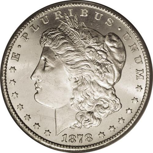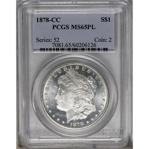 <B>1878-CC<img border='0' src='http://www.heritagecoins.com/images/star.gif' width=10 height=10>$1> MS65 Prooflike PCGS.</B></I> Attractive mirrored fields with brilliant silver surfaces and considerable cameo contrast provide excellent eye appeal. This is a lovely Gem example of the first Carson City Mint Morgan dollar issue. The delicate mirrored fields of prooflike and deep mirror prooflike coins serve as bagmark magnets, so few are found in Choice or Gem condition as offered here. Both letters of the mintmark are completely closed. Population: 88 in 65 Prooflike, 12 finer (6/06).<BR><I>From The Chicago-Ark Collection.</B></I>