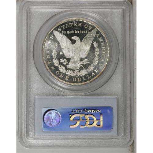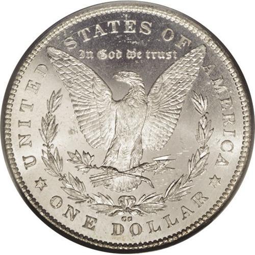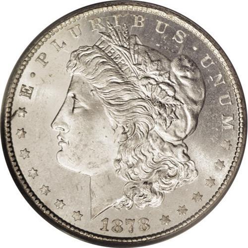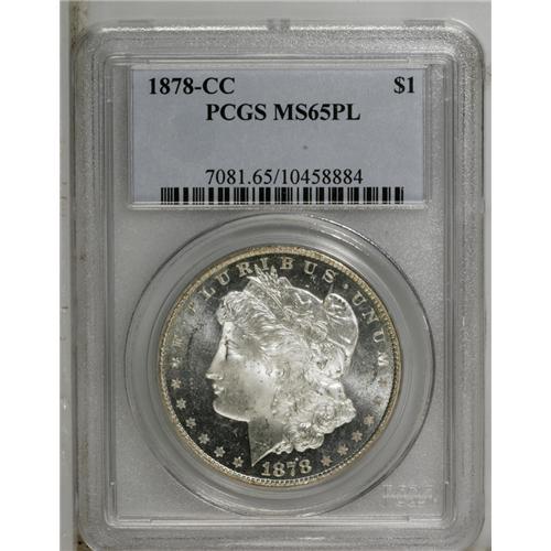 <B>1878-CC<img border='0' src='http://www.heritagecoins.com/images/star.gif' width=10 height=10>$1> MS65 Prooflike PCGS.</B></I> In his Red Book on Morgan dollars, Dave Bowers dug up an interesting commentary from the <I>Carson City Morning Appeal</B></I> from April 17, 1878 concerning the arrival of dies from the Philadelphia Mint. It indicates that the coins would be struck at the rate of 30,000 per day on the big Ajax press. In what must have been a critique of George Morgan's design, the commentary concluded: "Great disgust was expressed at the general appearance of the dies." That opinion has not endured since it was written, as evidenced by the thousands of collectors of this series over the past 100 years.<BR> As one would expect from an 1878-CC, the striking details are complete on each side. Like the coin above, the surfaces are brilliant. The fields exhibit strong, mirrored reflectivity and the devices have an especially thick overlay of mint frost which provides the contrast seen on this Gem coin. An exceptionally pleasing dollar, both in terms of eye appeal and technical preservation.