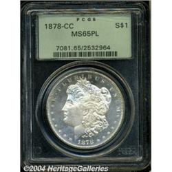 <B>1878-CC<S$1> MS65 Prooflike PCGS.</B></I> Attractive mirrored fields with brilliant silver surfaces and considerable cameo contrast provide excellent eye appeal. This is a lovely Gem example of the first Carson City Mint Morgan dollar issue. The delicate mirrored fields of prooflike and deep mirror prooflike coins serve as bagmark magnets, so few are found in Choice or Gem condition as offered here. Both letters of the mintmark are completely closed. Population: 75 in 65, 12 finer (7/04). <BR><BR><B>Important notice:</B> Heritage usually auctions material at the rate of 200-250 lots per hour. On some occasions eBay Live bid software or the Internet may not be able to keep up with the pace of the auction. We recommend placing a realistic absentee bid now as insurance to avoid disappointment. Occasionally the auctioneer may eliminate or reject an eBay Live bid, and the auctioneer may also reopen a lot after the close of the eBay live bidding (usually because we missed an audience bid), and may reject your bid even if it shows you as the winning bidder. By bidding via eBay Live, you agree that Heritage may award the lot to another bidder at its sole discretion under the circumstances described above or any other reasonable circumstances. Since eBay bids are not shown to us until we open the lot on the floor, we treat those bids just like floor bids. In most cases the floor responds before the eBay bid is presented to us, due to Internet lag time, so for consistency we have made it a policy that floor bids are always considered first over tie eBay live bids. Also please note that all Heritage lots purchased through eBay Live carry a 20% Buyer's Premium. Please make sure you read the Terms and Conditions before you bid. </span></font></tr></table></td></tr></table>