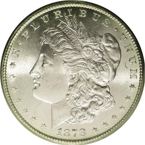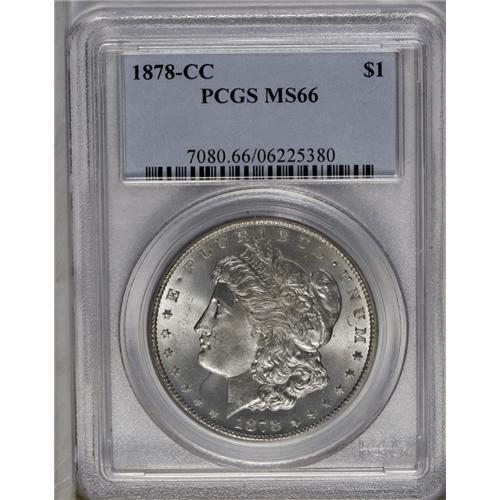 <B>1878-CC<img border='0' src='http://www.heritagecoins.com/images/star.gif' width=10 height=10>$1> MS66 PCGS.</B></I> A brilliant and boldly struck Premium Gem with potent cartwheel luster and lovingly preserved surfaces. An outstanding representative of this popular first year Carson City Morgan dollar issue. There is no sign of the die doubling that accompanies many dollar varieties from this year, although the lower wreath is distinguished by a series of lengthy raised die lines. Population: 186 in 66, only 4 are finer (5/06).