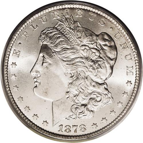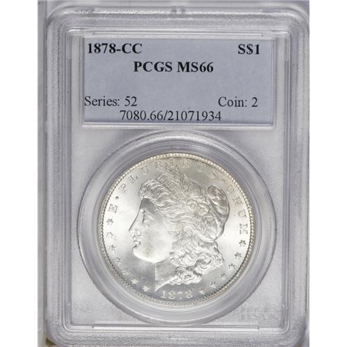 <B>1878-CC<img border='0' src='http://www.heritagecoins.com/images/star.gif' width=10 height=10>$1> MS66 PCGS.</B></I> Following passage of the Bland-Allison Act of 1878, Morgan dollars became the most extensively produced coinage up to that point in time. One clause in this Act set the Mint machinery in motion: "And the Secretary of the Treasury is authorized and directed to purchase, from time to time, silver bullion, at the market price thereof, not less than two million dollars worth per month, nor more than four million dollars worth per month, and cause the same to be coined monthly, as fast as so purchased, into such dollars." Richard Bland, a Congressman from Missouri, lived in Nevada during the early 1860s and was involved in the early history of Carson county in that state. This lovely Gem quality example is fully brilliant with frosty luster. It is sharply struck with exceptional aesthetic appeal. A trace of ivory color can be seen on otherwise bright silver-white surfaces.