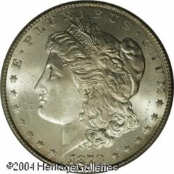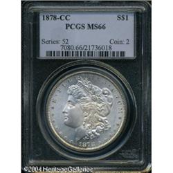1878-CC S$1 MS66 PCGS. Untoned and refreshingly cl <B>1878-CC S$1 MS66 PCGS.</B></I> Untoned and refreshingly clean for this first year Carson City issue, with shimmering cartwheel luster in the fields and heavily frosted devices. A prized issue in this virtually unsurpassable condition. Population: 186 in 66, 4 finer (11/04). <BR><BR><B>Important notice:</B> Heritage usually auctions material at the rate of 200-250 lots per hour. On some occasions eBay Live bid software or the Internet may not be able to keep up with the pace of the auction. We recommend placing a realistic absentee bid now as insurance to avoid disappointment. Occasionally the auctioneer may eliminate or reject an eBay Live bid, and the auctioneer may also reopen a lot after the close of the eBay live bidding (usually because we missed an audience bid), and may reject your bid even if it shows you as the winning bidder. By bidding via eBay Live, you agree that Heritage may award the lot to another bidder at its sole discretion under the circumstances described above or any other reasonable circumstances. Since eBay bids are not shown to us until we open the lot on the floor, we treat those bids just like floor bids. In most cases the floor responds before the eBay bid is presented to us, due to Internet lag time, so for consistency we have made it a policy that floor bids are always considered first over tie eBay live bids. Also please note that all Heritage lots purchased through eBay Live carry a 20% Buyer's Premium. Please make sure you read the Terms and Conditions before you bid. This lot is being auctioned in conjunction with a live floor auction by Heritage Galleries & Auctioneers. All final auction and invoice information will be supplied by Heritage Galleries & Auctioneers, and all other information should be considered preliminary. Lot:7309