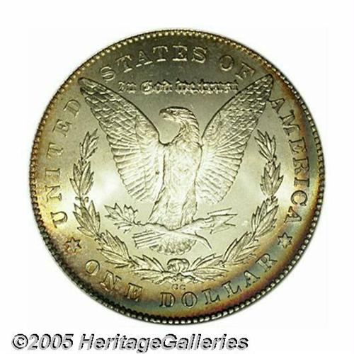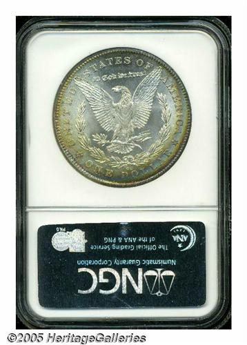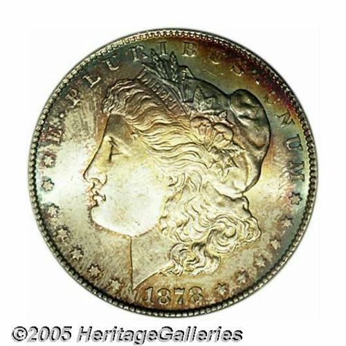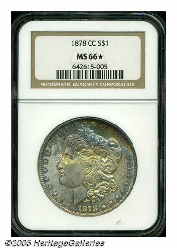 <B>1878-CC<S$1> MS66 <S NGC.</B></I> Most of the '78-CC dollars encountered in the marketplace are in Mint State, primarily in grades through MS64, and are also heavily bagmarked. Gems become scarce, and Premium Gems, especially those with the Star designation, are very rare. Indeed, this example is the finest Mint State specimen with the coveted <S designation, (5/05). Both sides show iridescent multicolored rainbow-like toning along the right (facing) borders on both sides. Splashes of gold and lavender patina roam over the remaining obverse surfaces. The design elements are crisply impressed. A minute contact mark or two on Liberty's cheek is mentioned for accuracy.