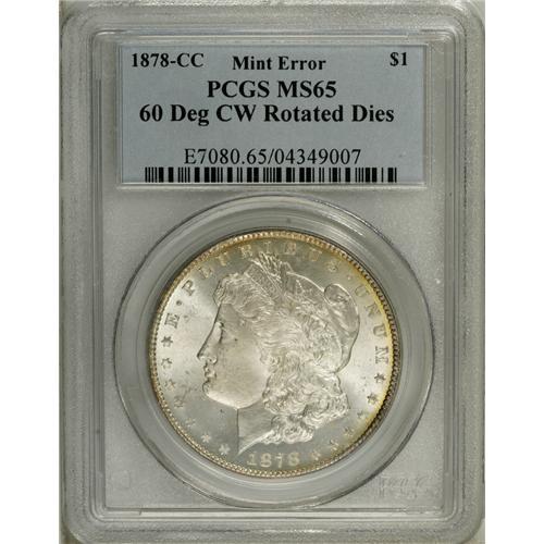 <B>1878-CC S$1 Morgan Dollar--Rotated Dies--MS65 PCGS.</B></I> An interesting example that exhibits 60 degrees of clockwise die rotation. Each side is essentially untoned with a little gold at selected border areas. An unquestionable Gem and an exciting mint error.<BR><BR><b>Shipping:</b> Coin/Currency (<a target="_blank" href="http://www.heritageauctions.com/common/shipping.php">view shipping information</a>)