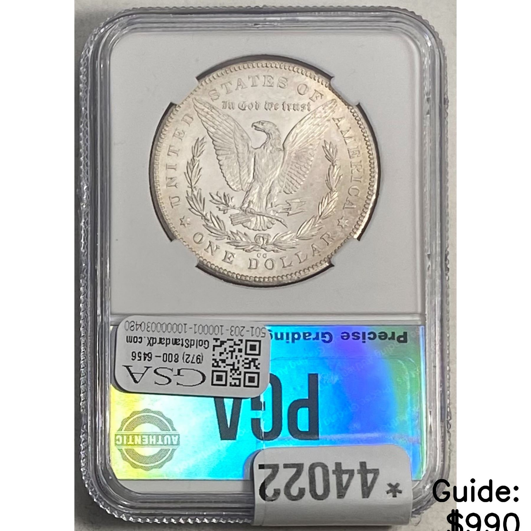 e. Coins sold referencing a third-party grading service are sold “AS IS” without any express or implied warranty, except for a guarantee by GSA that they are genuine. Removal or alteration of the holder, voids all of Bidder’s claims concerning that Product. Certain warranties may be available from the grading services and Bidders are referred to them for further details: Numismatic Guaranty Corporation (NGC), PO Box 4776, Sarasota, FL 34230, www.ngccoin.com/services/writtenguarantee.asp; Professional Coin Grading Services (PCGS), PO Box 9458, Newport Beach, CA 92658, www.pcgs.com/guarantee.html; ANACS, 6555 S. Kenton St., Ste. 303, Englewood, CO 80111; and Independent Coin Grading Co. (ICG), 7901 East Bellview, Ave., Suite 50, Englewood, CO 80111.