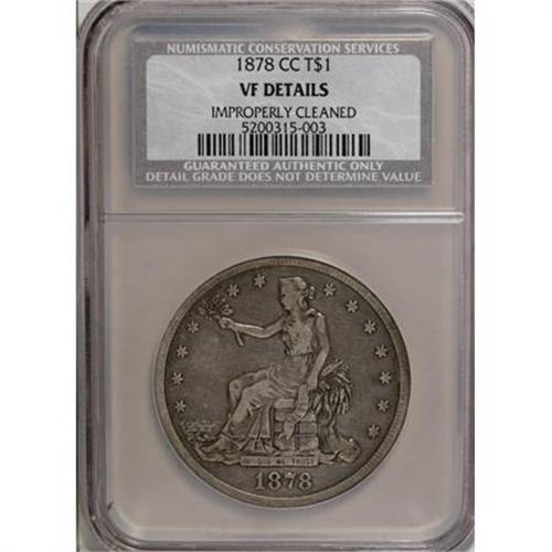 <B>1878-CC T$1 --Improperly Cleaned--NCS .VF Details.</B></I> NGC Census: (0/0). PCGS Population (0/0). Mintage: 97,000. (#7047)<BR><BR><B>Coin Engraver:</B> William Barber<BR><BR><b>Shipping:</b> Coins & Currency (<a target="_blank" href="http://www.heritageauctions.com/common/shipping.php">view shipping information</a>)