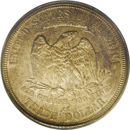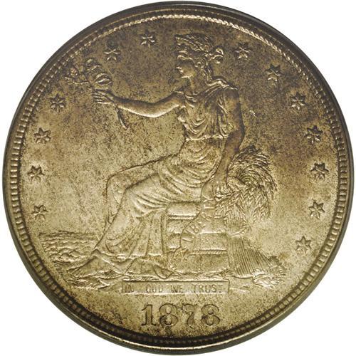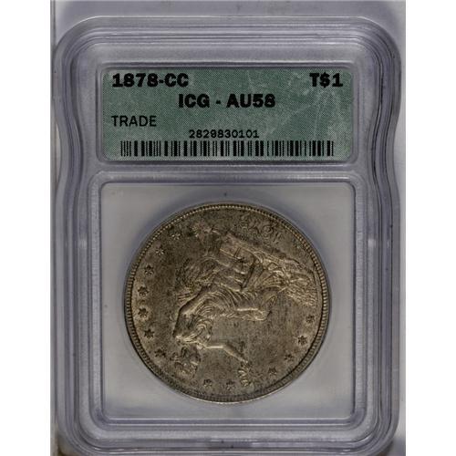 <B>1878-CC<T$1> AU58 ICG.</B></I> After a strong start in producing Trade dollars at the Carson City Mint in the early 1870s, by 1878, the year that Morgan dollars were introduced, coinage had dwindled to a puny 97,000 examples, compared to more than 2 million of the CC-mint Morgan issue. The present example shows a light gray-gold patina on each side and considerable luster, despite the grade-consistent touch of rub present. A light peppering of gray toning spots can be seen under a glass, but they are neither heavy nor distracting. An attractive, well struck near-Mint State example of the last CC-mint Trade dollar emission.<BR><I>From The Guadalupe Collection, Part Two.</B></I>