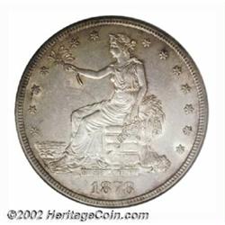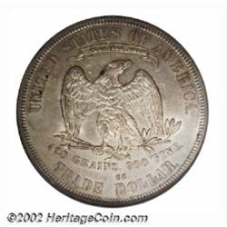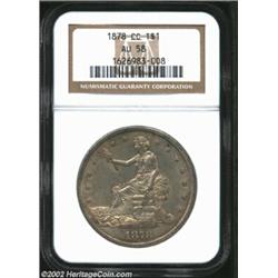1878-CC T$1 AU58 NGC. Slate-gray in color with abundant silvery luster across the stars, legends, and devices. A well struck and nicely preserved example that has bold details on the head, upper stars, and talons. An issue that is even more rare than the mintage of 97,000 pieces would suggest, since an unknown quantity were melted by the mint on July 19, 1878. The majority of survivors are in VF to XF grades, with Borderline Uncirculated specimens extremely elusive. Business strike production of Trade Dollars ended that year, the same year that the Morgan Dollar made its debut. While the Carson City Mint would never strike another Trade Dollar after 1878, proof mintage of the series continued in Philadelphia through 1885. Important notice: We expect to be auctioning lots at the rate of 200-250 per hour. Sometimes eBay Premier live bid software cannot keep up with that pace, so we strongly recommend that you place a realistic proxy bid now as insurance to avoid disappointment. Also please note that all Heritage/CAA lots purchased through eBay Premier carry a 20% Buyer's Premium. Please make sure you read the Terms and Conditions.