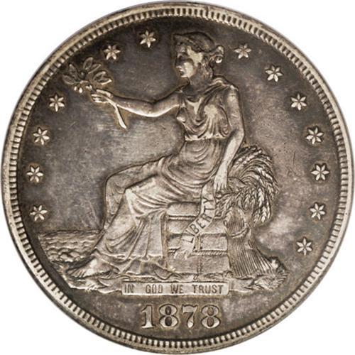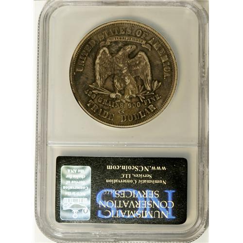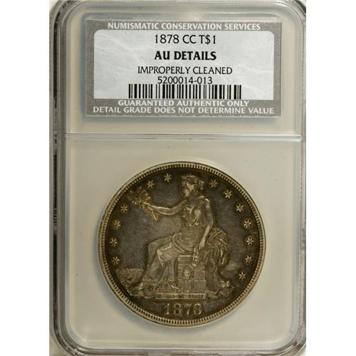 <B>1878-CC T$1 --Improperly Cleaned--NCS. AU Details.</B></I> Traces of powdery residue within AMERICA confirm a cleaning, but this tawny-gold, plum-red, and gunmetal-blue representative has richly detailed devices. The first and final Carson City trade dollars are the keys to the circulation series.<BR><BR><b>Shipping:</b> Coins & Currency (<a target="_blank" href="http://www.heritageauctions.com/common/shipping.php">view shipping information</a>)