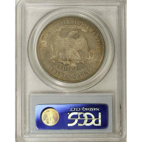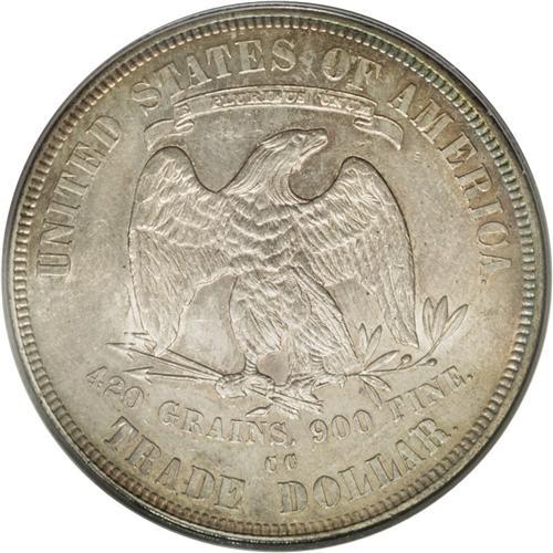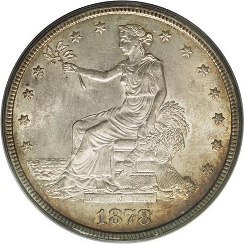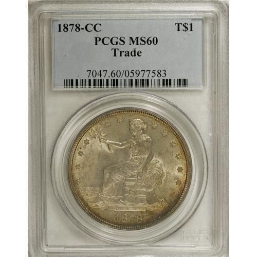 <B>1878-CC T$1 MS60 PCGS.</B></I> The 1878-CC is considered by numismatists to be the rarest of the business strike Trade dollars. David Bowers (1993) wrote: "Secretary of the Treasury John Sherman, who disliked Trade dollars intensely, mandated on February 22, 1878, that no Trade dollars would be paid out for deposits of bullion made prior to the order for discontinuance when received at Carson City. When this order reached Carson City, this branch mint had already struck 97,000 pieces...the smallest business strike quantity of the denomination. Thus a rarity was created." Moreover, 44,148 undistributed Trade dollars, presumably dated 1878-CC, were consigned to the melting pot.<BR> This MS60 example displays peripheral whispers of golden-brown, lavender, and cobalt-blue toning and soft luster. The strike was well executed, as determined from crisp definition on most of the design elements; Liberty's hair at the ear reveals minor softness. Close examination shows some minor handling marks on each side. All in all, a nice key-date coin, perhaps somewhat conservatively graded. Population: 3 in 60, 21 finer (1/07).<BR><BR><b>Shipping:</b> Coins & Currency (<a target="_blank" href="http://www.heritageauctions.com/common/shipping.php">view shipping information</a>)