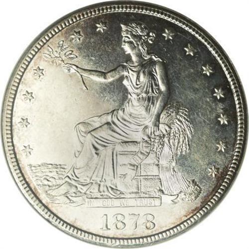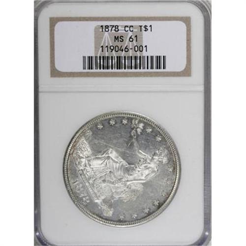 <B>1878-CC T$1 MS61 NGC.</B></I> The 1878-CC is the most popular rarity among business strike Trade dollars, largely due to its mintage, which by far is the lowest of the series (97,000 pieces). Moreover, according to mint records, 44,148 undistributed Trade dollars were melted on July 19, 1878. If all these were dated 1878-CC, as is generally assumed, a net mintage of 52,852 was available for distribution.<BR> Paul Green, in a July 12, 2005 <I>Numismatic News</B></I> article entitled "1878-CC Trade Dollar Was Heavily Melted," brings in an additional factor to help explain the issue's rarity, saying "... the Trade dollar was unpopular and over the next few years, it is likely that a large number of that (net) mintage was destroyed, potentially making it even tougher than the already low mintage." Whatever the factors underlying its rarity, NGC and PCGS have graded fewer than 200 '78-CC Trade dollars in all grades combined, of which less than 50 are Mint State.<BR> The MS61 survivor offered in this lot exhibits satiny surfaces that yield a pleasing cameo-like effect on both sides, with wisps of reddish-tan and sky-blue color at the peripheries, and occasional blushes of light tan-gold in the fields. The design elements are uniformly well struck, with only portions of Liberty's hair revealing minor softness. Some light handling marks are visible under magnification, slightly more so on the obverse, but none are pronounced enough to detract from the coin's overall eye appeal. Census: 9 in 61, 15 finer (10/07).<BR><BR><B>Coin Engraver:</B> William Barber<BR><BR><b>Shipping:</b> Coins & Currency (<a target="_blank" href="http://www.heritageauctions.com/common/shipping.php">view shipping information</a>)