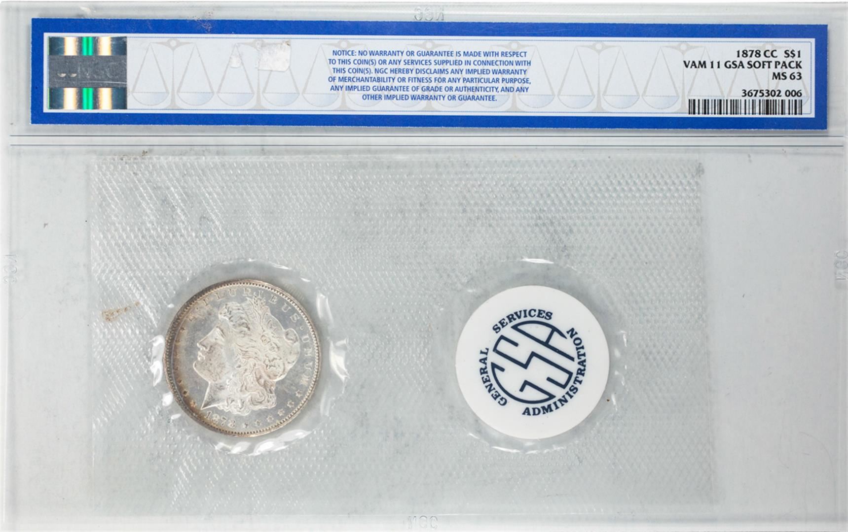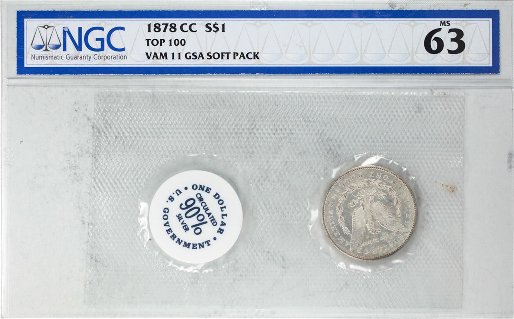 One 1878-CC VAM11 $1 Morgan Silver Dollar GSA Soft Pack NGC MS63 Top 100. NGC Certified.