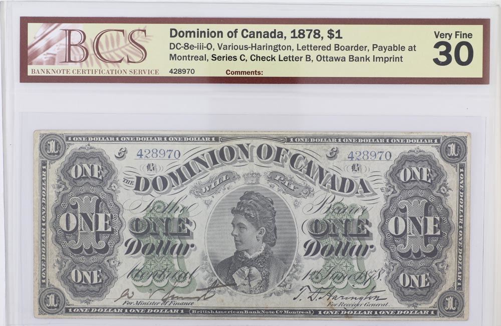 1878 Dominion of Canada $1. DC-8e-iii-O, Lettered Boarder, Payable at Montreal, Ottawa Imprint, S/N: 428970, BCS VF-30. A well centered example free of any holes, tears or graffiti. Single highest graded example by BCS.