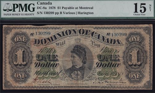 1878 Dominion of Canada One Dollar - Payable at Montreal CH DC-8a. PMG Choice F15, net. (Minor foreign substance). S/N:130299/B.