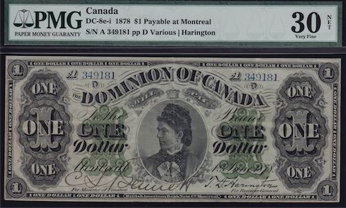 1878 Dominion of Canada One Dollar - Payable at Montreal CH DC-8e-i. PMG VF30, net, splits. S/N:349181/A.