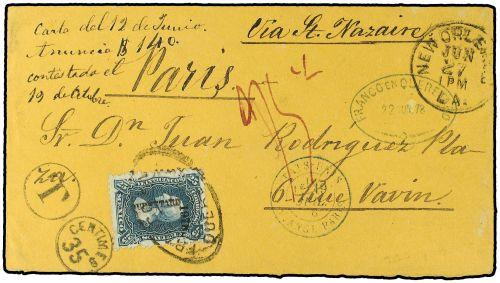 1878 Envelope to FRANCE bearing 25 cent blue (SG 99) overprinted with date and district name QUERETARO and tied by oval FRANCO QUERETARO datestamp, underpaid with manuscript "35c" and TAX 35 CENTIMES handstamp routed via New Orleans and New York with ETATS-UNIS V ANGL-PARIS (Salles 1791) datestamp in blue. Attractive and rare item of overseas mail.