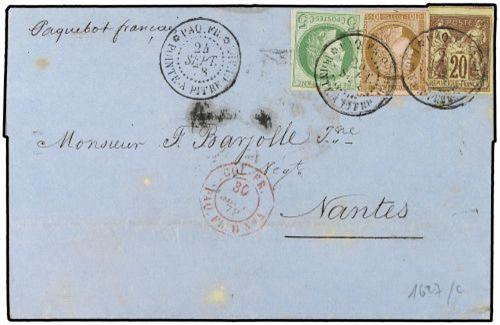 1878 Envelope to FRANCE bearing French General Colonies Ceres 5 cents green (Yvert 17) and 10 cents brown on rose (Yvert 18) mixed with Type Sage 20 cents brown (Yvert 34) tied by PAQ. FR. POINTE-A-PITRE GUAD datestamp with octagonal French paquebot COL FR PAG. FR. B. Nº 4 datestamp in red, sent by French steamer with Nantes arrival on reverse. Superb three colour franking.
