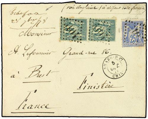 1878 FRONTAL. CHEFOU a FRANCIA. Indicación manuscrita en el frente "Tchefoa 28-Sept.-78 y franqueada con sellos franceses de 5 cts. verde y 25 cts. azul , mat. GC 5104 en SHANG-HAI. MUY RARA.