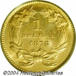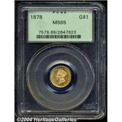 <B>1878<G$1> MS65 PCGS.</B></I> An issue that is seldom offered as a Gem, the 1878 (3,000 business strikes produced) is the rarest post-1875 Gold Dollar after the 1876. The finish is expectantly semi-prooflike for a low mintage Gold Dollar from the late 1870s, and the devices display pinpoint striking definition in all areas. Reddish-gold in color, the smooth, virtually distraction-free surfaces reveal some counterclockwise die rotation. Population: 13 in 65, 5 finer (3/04). <BR><BR><B>Important notice:</B> Heritage usually auctions material at the rate of 200-250 lots per hour. On some occasions eBay Live bid software or the Internet may not be able to keep up with the pace of the auction. We recommend placing a realistic absentee bid now as insurance to avoid disappointment. Occasionally the auctioneer may eliminate or reject an eBay Live bid, and the auctioneer may also reopen a lot after the close of the eBay live bidding (usually because we missed an audience bid), and may reject your bid even if it shows you as the winning bidder. By bidding via eBay Live, you agree that Heritage may award the lot to another bidder at its sole discretion under the circumstances described above or any other reasonable circumstances. Since eBay bids are not shown to us until we open the lot on the floor, we treat those bids just like floor bids. In most cases the floor responds before the eBay bid is presented to us, due to Internet lag time, so for consistency we have made it a policy that floor bids are always considered first over tie eBay live bids. Also please note that all Heritage lots purchased through eBay Live carry a 20% Buyer's Premium. Please make sure you read the Terms and Conditions before you bid. </span></font></tr></table></td></tr></table>